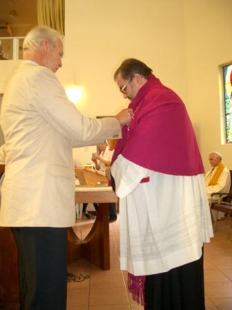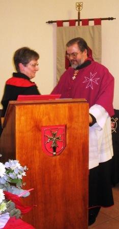 The Vice-President of the South African Relief Organisation of the Order of Malta, Mrs Clare Kalkwarf D.M. presents Fr. Gérard with the cross of a conventual chaplain ad honorem.